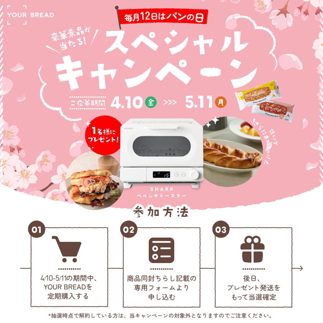 この度、YOUR BREADは「毎月12日はパンの日」を記念し、公式サイト購入者限定で豪華プレゼントが当たる「パンの日キャンペーン 第4弾」を開催します。
