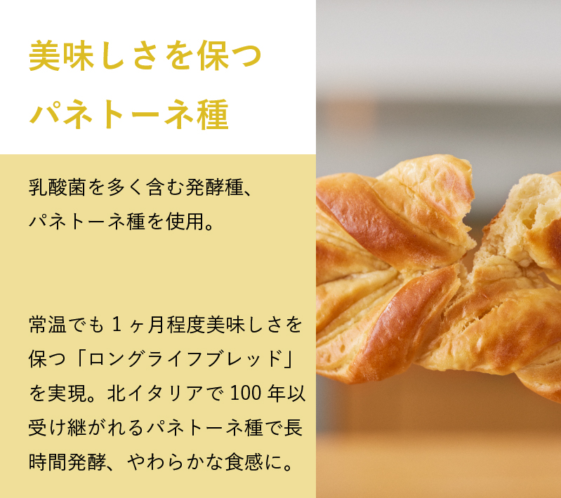 〇乳酸菌を多く含む発酵種「パネトーネ種」により、ふっくらやわらかさとおいしさが長持ちします。